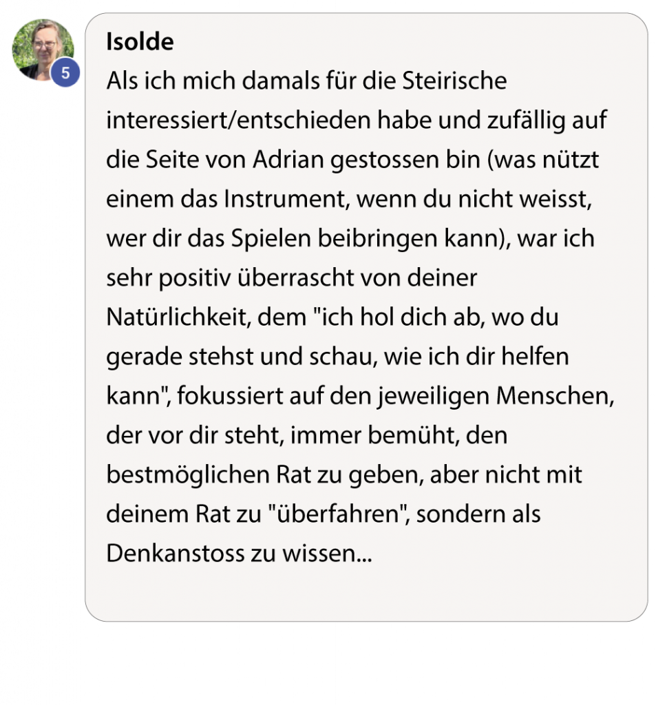 Adrian ist aufmerksam, ruhig und ehrlich interessiert an dem Menschen hinter dem Instrument. Er hört zu, fragt nach und nimmt sich Zeit, wirklich zu verstehen, wo jemand gerade steht – musikalisch, aber auch persönlich.